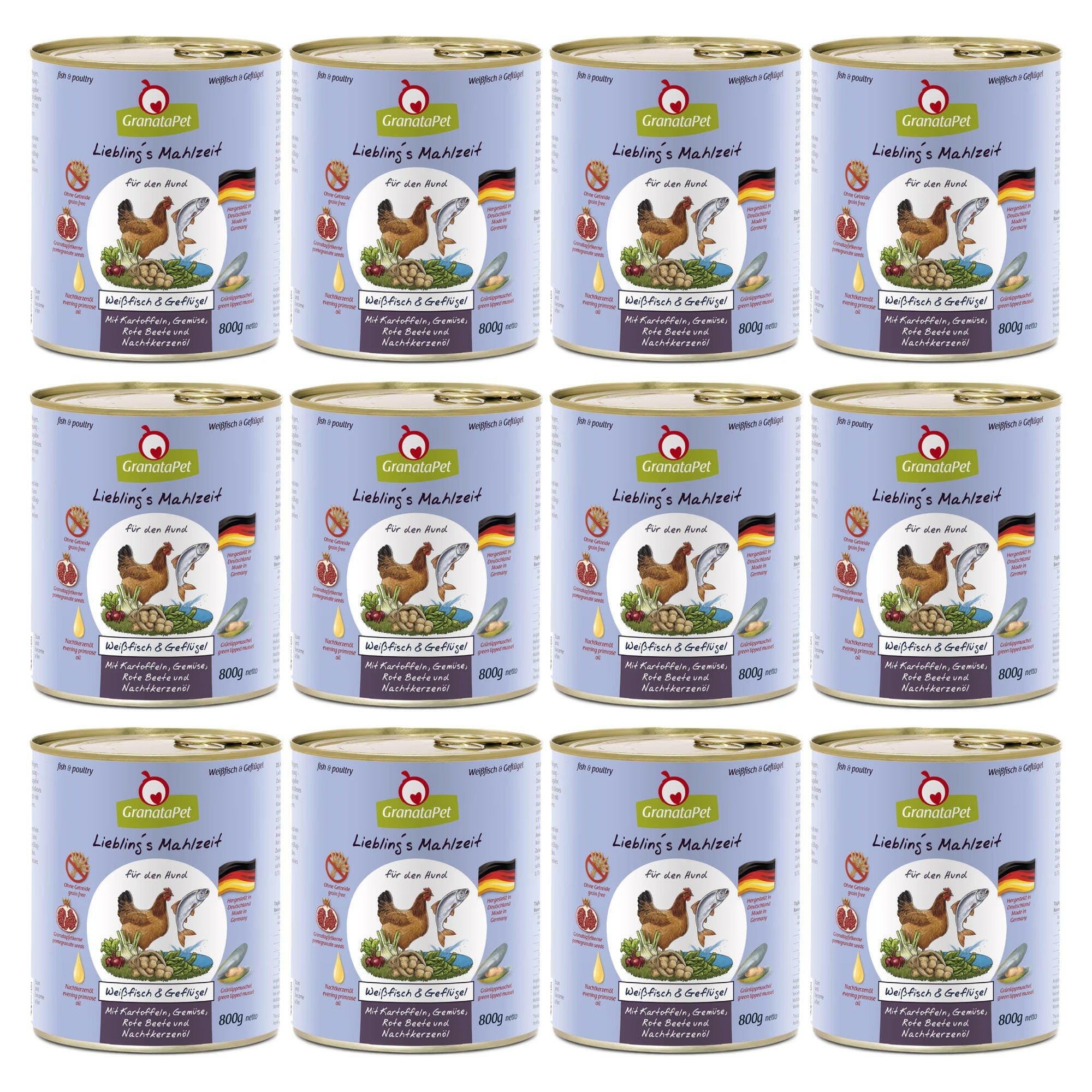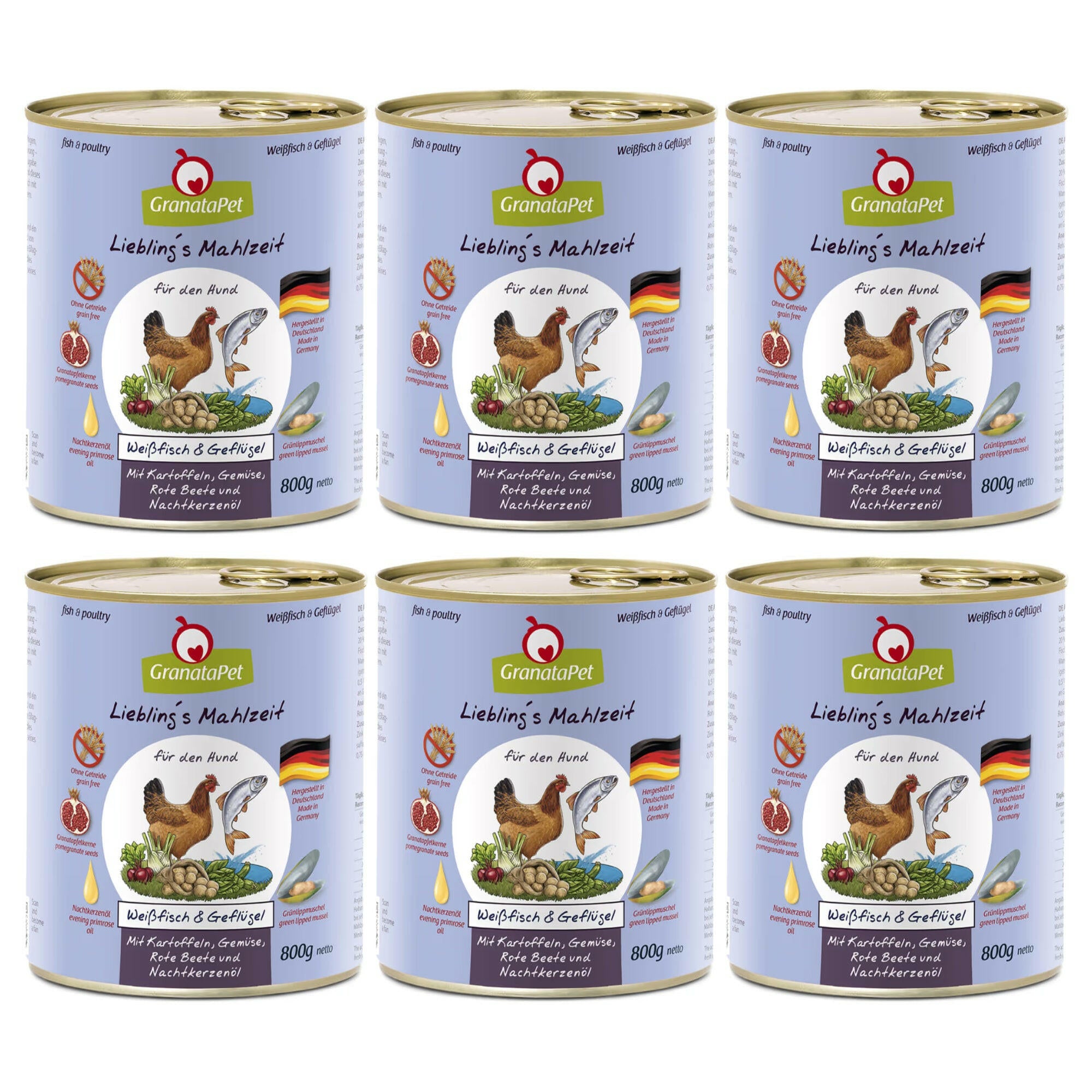Wet dog food, GranataPet, Fish & Poultry with poultry, fish, potatoes, fennel, zucchini, and evening primrose oil, produced from the highest quality ingredients. Only muscle meat and high-quality offal (e.g., hearts, liver, stomachs) are used in its production. No by-products such as blood, claws, bones, beaks, or feathers are used, and no fillers or meat substitutes are added. It is enriched with valuable additives such as pomegranate seeds, high-quality oils (e.g., borage, flaxseed, evening primrose), and green-lipped mussels. These enhance the nutritional value and flavor of the meal. The food is produced in Germany with full traceability of ingredients at every stage of the production process. Raw materials are sourced from trusted and verified suppliers, subjected to full veterinary control, and tested by internal and external laboratories. GranataPet food is prepared using a gentle steaming method to retain as many nutrients as possible. It is a protein-rich, easily digestible, and completely grain-free meal. The food also contains no sugar, artificial preservatives, colorings, flavor enhancers, or GMOs. GranataPet food is a recipe for: healthy skin and a shiny coat, strong heart and muscles, proper digestion and intestinal function, strong bones and flexible joints. Wet food is also a way to hydrate your dog. The right level of water in the body is essential for its health. Due to the high moisture content of wet food, the dog does not need to drink as much as when fed dry kibble. Feeding wet food is also better for dogs prone to urinary stones. By feeding GranataPet to your pet, you can be sure you are providing a tasty, healthy, and well-balanced meal every day. Wet food poultry and fish GranataPet Liebling's Mahlzeit Fish & Poultry: is a complete meal for adult dogs containing 65% muscle meat and offal from poultry and fish. Poultry provides a large amount of valuable and easily digestible protein, essential for the proper functioning of the dog. It is characterized by low fat content and high nutritional value. A source of B vitamins and minerals such as iron, magnesium, zinc, selenium, phosphorus, and potassium. Fish provides the body with unsaturated fatty acids and easily digestible protein. Pomegranate seeds contain a wide range of health-promoting ingredients. They contain high amounts of ellagic acid, a natural antioxidant and effective cell protection agent. Pomegranate seeds have a beneficial effect on the immune, cardiovascular, and nervous systems. Evening primrose oil provides a dose of polyunsaturated omega-6 fatty acids, various amino acids, and vitamin E. It improves the condition of the skin and coat, has anti-inflammatory properties, and positively affects the joints. New Zealand green-lipped mussel provides a dose of glucosamine and chondroitin, essential for the proper functioning of the dog's musculoskeletal system. Potatoes provide energy for the dog, are easily digestible, and contain significant amounts of vitamin C, B1, B3, niacin, and minerals. Interestingly, potatoes have a positive effect on cholesterol levels. Fennel is a sweet and aromatic vegetable. The essential oils contained in it positively influence digestive processes. It is a valuable source of plant protein, beta-carotene, vitamins C and B, and fiber. Zucchini is a low-calorie and easily digestible vegetable that provides valuable plant protein, minerals, iron, and vitamin C. It also contains beta-carotene, positively affecting the vision and skin condition of the dog. It contains no grains, slaughterhouse by-products, sugar, artificial preservatives, colorings, flavor enhancers, or GMOs. Feeding instructions and dosage: The data provided in the table is approximate. Observe your pet and adjust the amount of food given as needed. It is recommended to feed the dog in two portions per day. Do not leave wet food open for longer than a few hours. If the dog has not eaten it all before the next meal, the leftovers should be discarded, the bowl thoroughly rinsed, and only then should fresh food be placed in it. Open packages of wet food should be stored in the refrigerator in an airtight container for no longer than three days. Before serving food from the refrigerator, it should be warmed up again, as dogs do not tolerate cold or cool food well. NUTRITIONAL RECOMMENDATIONS Dog weight Daily portion of food Normal activity Low activity 5-10kg 320-540g 280-470g 10-20kg 540-905g 470-785g 20-30kg 905-1230g 785-1060g 30-40kg 1230-1525g 1060-1315g 40-50kg 1525-1800g 1315-1555g Ingredients: fish and poultry meat 65% (fish 20% and poultry 45% consisting of muscle meat, hearts, liver), fish and poultry broth 22.4%, potatoes 5%, beets 2%, Swiss chard 1%, zucchini 1%, fennel 1%, pomegranate seeds 1% (dried and finely ground), minerals 1%, evening primrose oil 0.5%, green-lipped mussel 0.1% (finely ground, natural).
