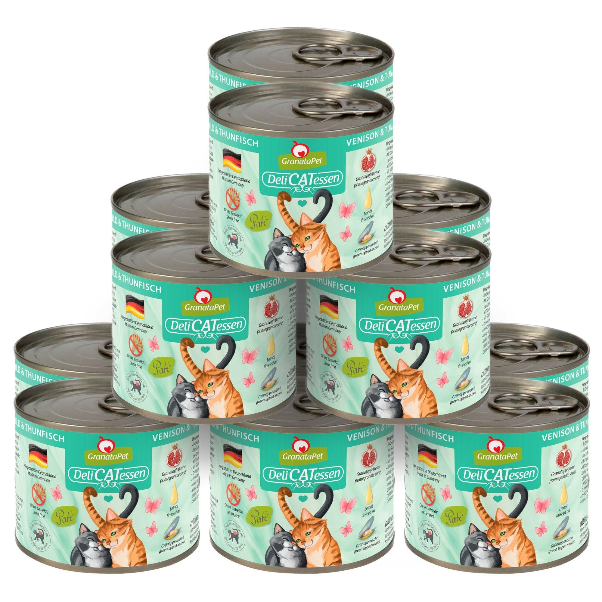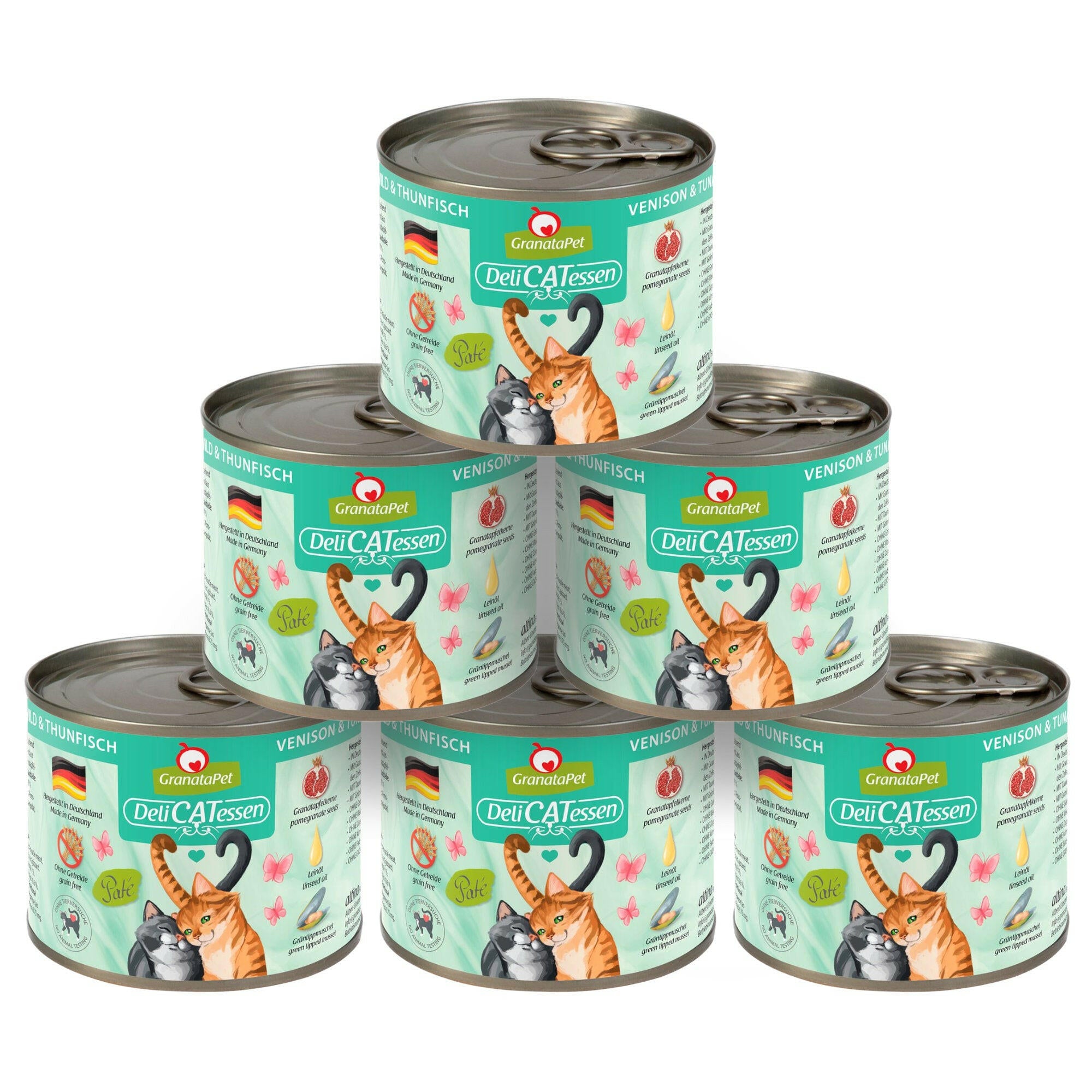 GranataPet Venison & Tuna šlapias maistas katėms: pilnavertis maistas suaugusioms katėms, kuriame yra 72% raumenų mėsos ir subproduktų iš elnienos ir tuno. Elniena apima stirnų, tauriųjų elnių, dėmėtųjų elnių ir sika elnių mėsą. Palyginti su naminių gyvulių mėsa, elniena turi iki keturių kartų daugiau maistinės vertės, yra mažai riebalų ir turi daug lengvai virškinamų baltymų. Tunas suteikia vertingų baltymų, nesočiųjų riebalų rūgščių Omega 3 ir Omega 6, jodo, cinko ir vitamino D3. Granatų sėklos turi platų sveikatą skatinančių ingredientų spektrą. Jos yra turtingos elaginės rūgšties, natūralaus antioksidanto ir veiksmingo ląstelių apsaugotojo. Granatų sėklos teigiamai veikia imuninę, širdies ir kraujagyslių bei nervų sistemas. Linų sėmenų aliejus yra nesočiųjų riebalų rūgščių omega 3 ir omega 6 šaltinis, gerinantis odos ir kailio būklę bei naudingas sąnariams. Taurinas yra medžiaga, kurios katės organizmas negali pagaminti pakankamu kiekiu, todėl ji turi būti tiekiama per maistą. Taurinas yra atsakingas už tinkamą regėjimą, širdies funkciją bei nervų ir imuninės sistemos veiklą. Jo trūkumas nėščioms katėms gali sukelti persileidimą. Maistas neturi grūdų, skerdyklų atliekų, cukraus, dirbtinių konservantų, dažiklių, skonio stipriklių ar GMO.