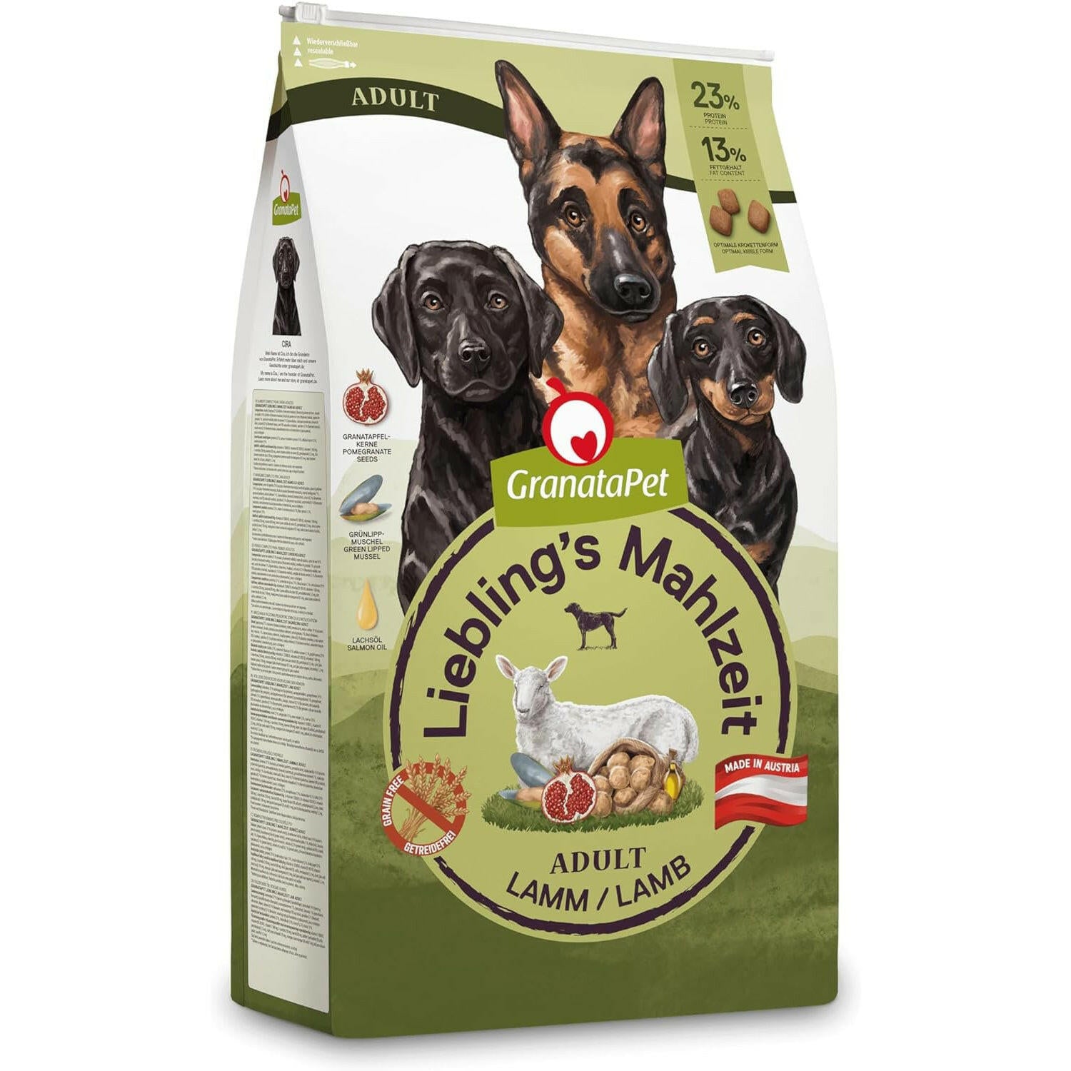 Täiskasvanud koerte toit, GranataPet Lamb Adult lambalihaga, valmistatud kõrgeima kvaliteediga koostisosadest. Selle tootmisel kasutatakse ainult lihasliha ja kvaliteetset rupsi (nt südamed, maksad, maod). Ei kasutata kõrvalsaadusi nagu veri, küünised, luud, nokad ega suled ning ei lisata täiteaineid ega lihasubstituute. Toit on rikastatud väärtuslike lisanditega nagu granaatõunaseemned, kvaliteetne lõheõli ja rohelise huulega rannakarp. Need parandavad toidu toiteväärtust ja maitset. Toit toodetakse Austrias, tagades koostisosade täieliku jälgitavuse tootmisprotsessi igas etapis. Tooraine pärineb usaldusväärsetelt ja kontrollitud tarnijatelt, allutatakse täielikule veterinaarkontrollile ning testitakse sise- ja välislaborites. GranataPet toit on loodud säilitama võimalikult palju toitaineid nendes väikestes, aromaatsetes graanulites. See on proteiinirikas, kergesti seeditav ja täiesti teraviljavaba eine. Toit ei sisalda suhkrut, kunstlikke säilitusaineid, värvaineid, maitsetugevdajaid ega GMO-sid. GranataPet toit on retsept: tervele nahale ja läikivale karvale, tugevale südamele ja lihastele, korralikule seedimisele ja soolestiku talitlusele, tugevatele luudele ja paindlikele liigestele, energiale kogu päeva tegevuseks.