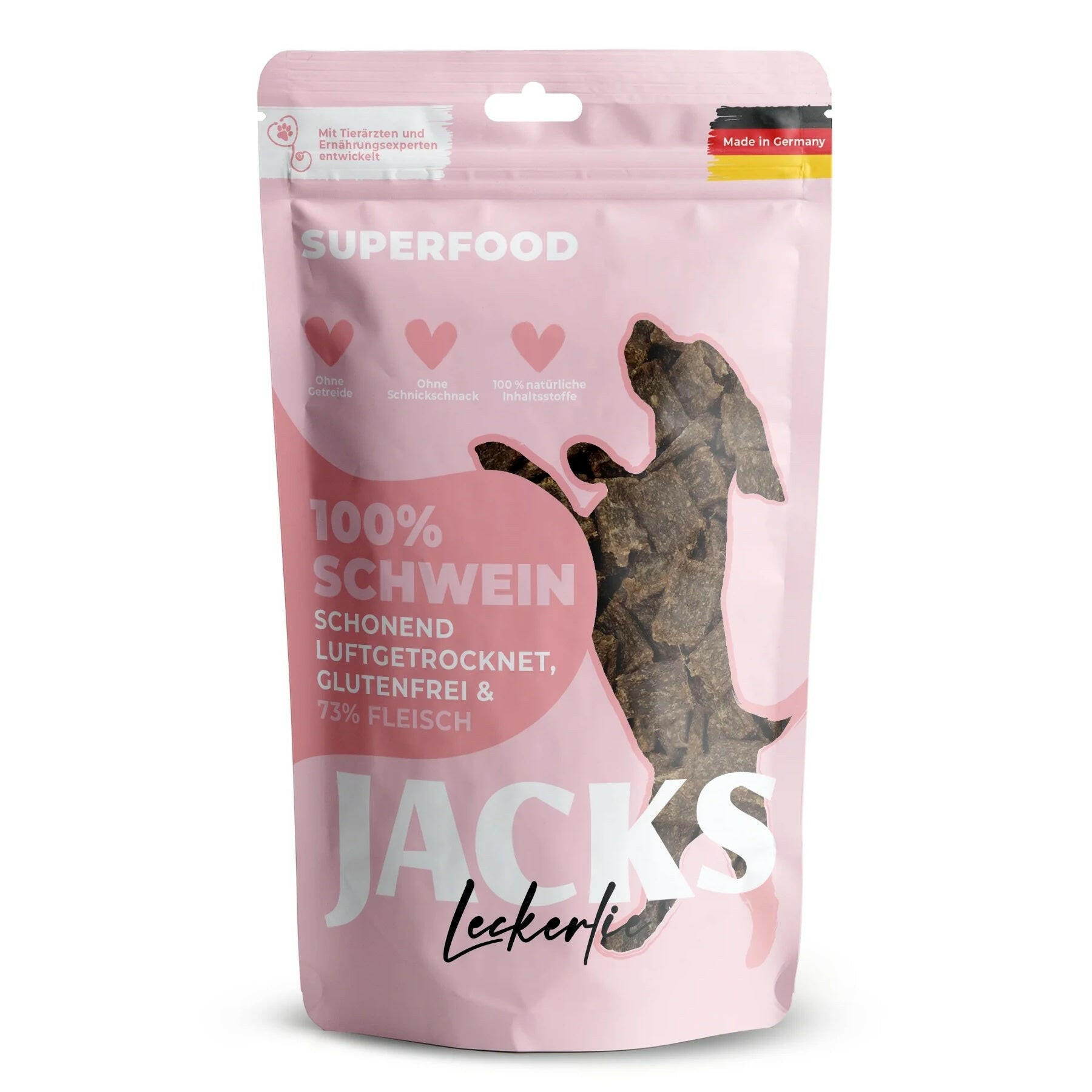 Jacks Leckerlie Superfood Pork delights with exquisite flavor and natural ingredients. This healthy snack for dogs consists of 73% pork meat. As a result, the treats contain a lot of valuable animal protein, and the addition of plant-based ingredients provides plenty of vitamins and trace elements. You won't find unnecessary flavors, sugar, grains, or colorings in them, making them suitable for individuals with sensitive digestive systems and allergies. The soft texture and high digestibility make them an ideal snack for dogs of all ages. The treats are produced in Germany, in the spirit of sustainability, under the supervision of veterinarians and animal nutrition specialists, with all ingredients sourced from regional lands. They are gently air-dried to preserve their natural, full flavor. Your dog will be eagerly awaiting the next portions of this delicious treat. At home, on walks, during training, or while traveling - thanks to the convenient form of small pieces, they can be easily given in any situation. They are also great as a filling for treat toys. The packaging in the form of a small zip bag helps maintain the product's freshness and aroma for a long time, while also making it easy to take on the go. A wide selection of flavors helps break the routine in your dog's diet.